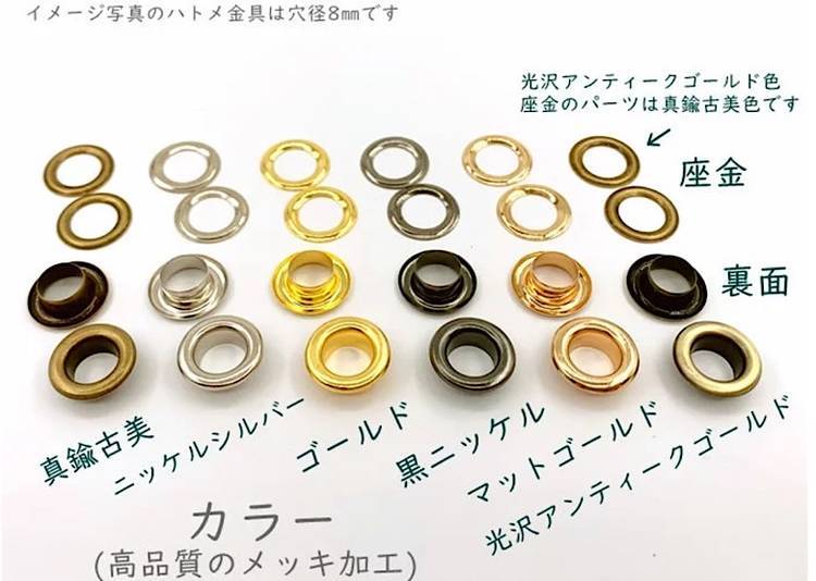 ハトメの素材は真鍮やアルミ、ステンレスなどでできており、色も黒や金、シルバーなど様々な種類があります。