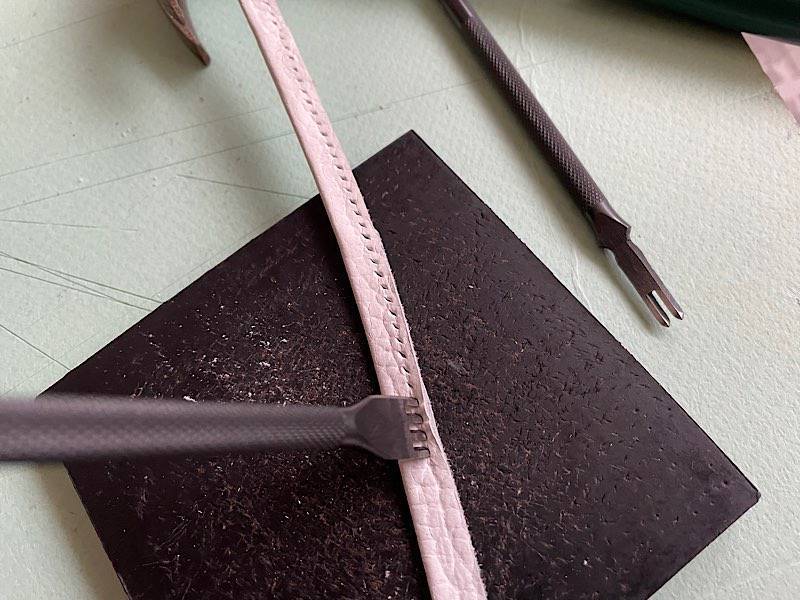 最後に折り込んだ革の縁を菱目打ち、縫い。