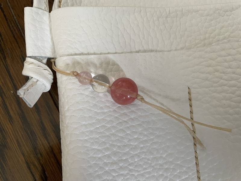 家にあった天然石をポシェット本体を縫った端糸を通して結んだだけですが、良いアクセントになって私は気に入ってます。 使うのは娘ですが…